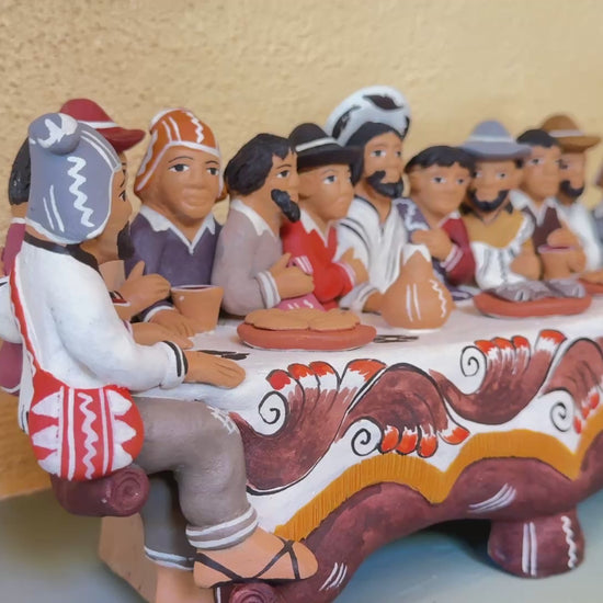 A hand crafted Andean interpretation formed in terracotta and finished with traditional Ayacucho pigments. Figures wear highland attire and sit at a compact table, reflecting a living folk art lineage sustained by small family workshops.