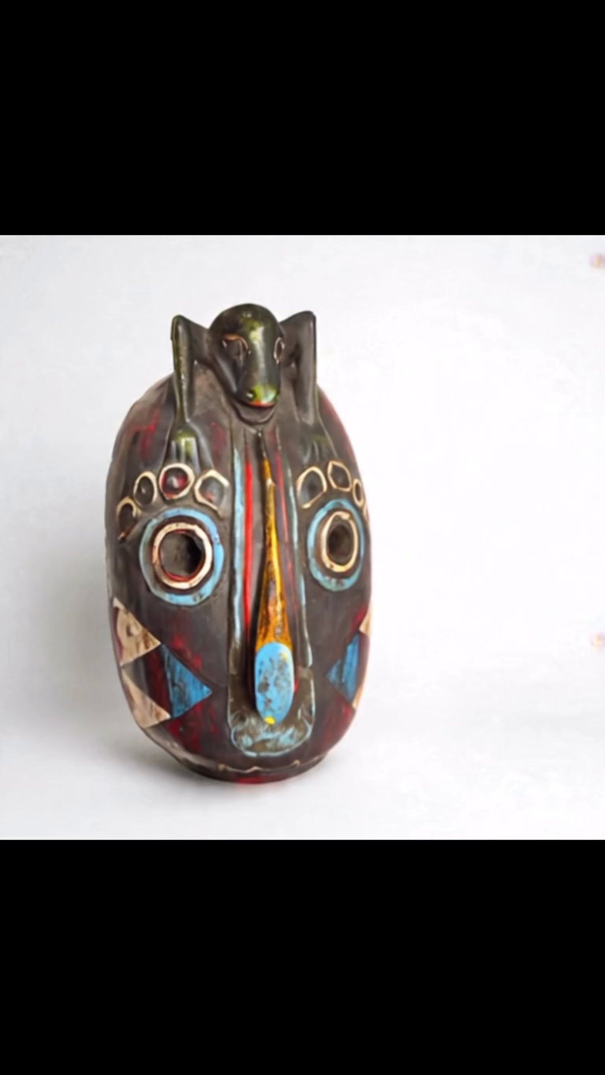 - Features: Concentric ring eyes with drilled vision holes. Cheeks painted with multicolor triangle fields. Lower rim incised with zigzag jaw motif. Suspension hole with cord at the top